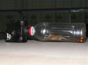 Place bait into your empty plastic bottle (12 oz, 16 oz, 1 and 2 liter bottles will work). Then attach bottle to Mouse catcher plastic cheese wedge. Mice enter bottle through the device,